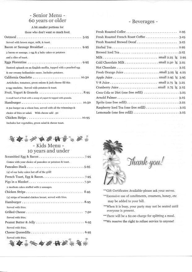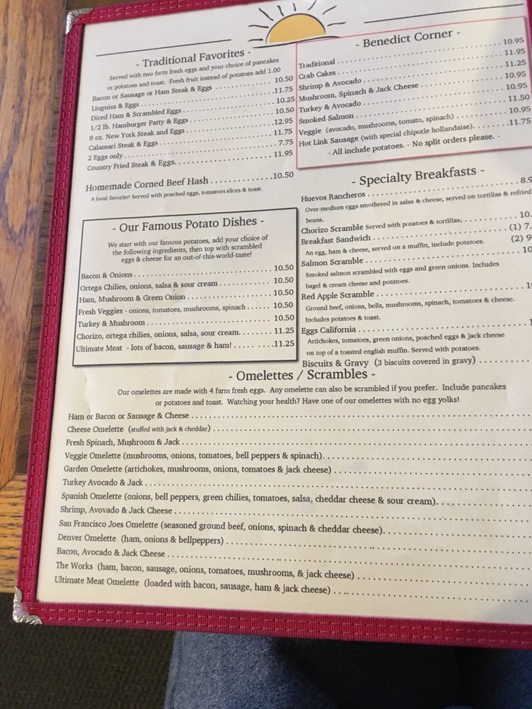 Artichokes, tomatoes, green onions poached eggs and jack cheese. Served with potatoes.