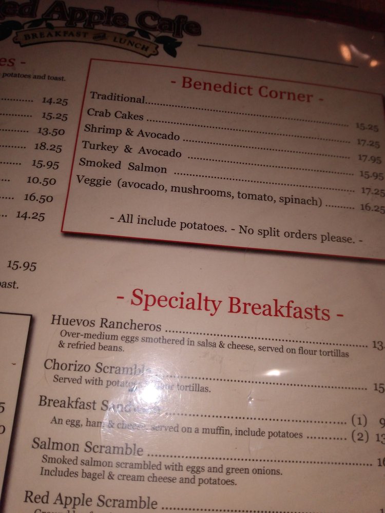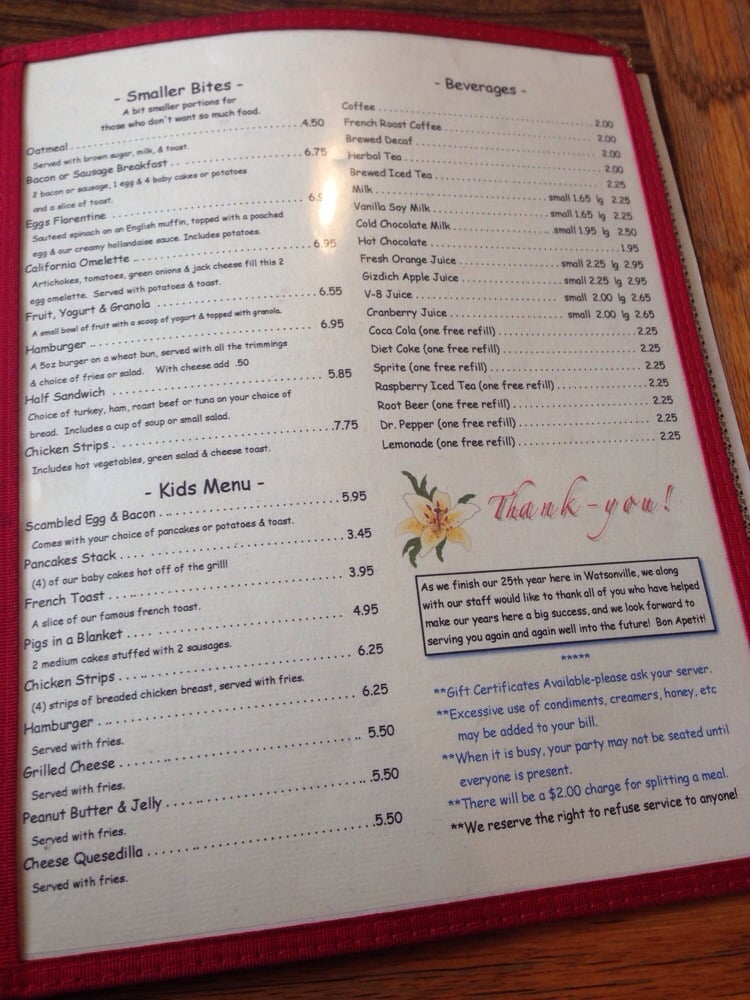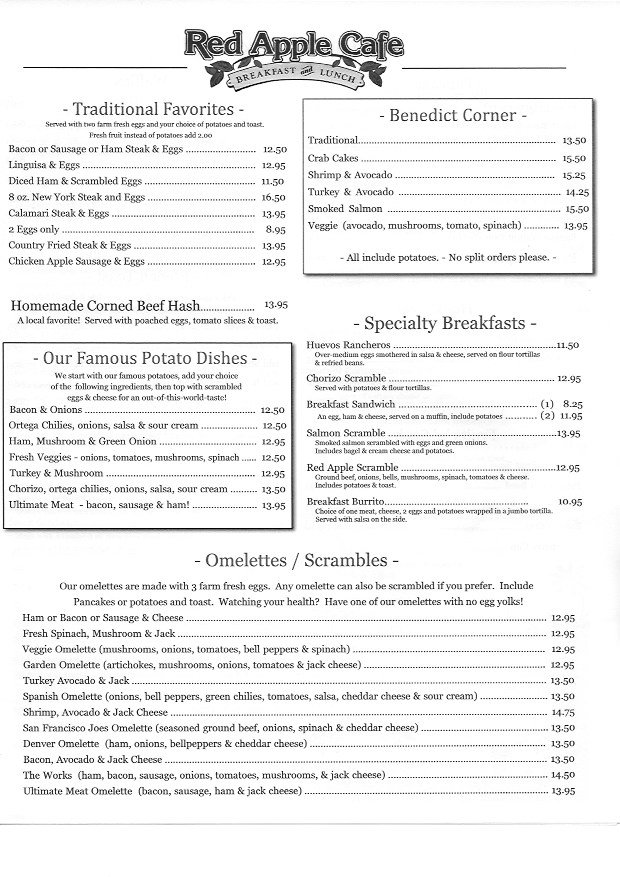 Introducing the menu at Red Apple Cafe, a charming Mom & Pop shop in Watsonville, CA, offers a delightful mix of burgers, breakfast & brunch items, and sandwiches. The cafe provides a comfortable ambiance with attentive staff and tasty, fresh dishes. With a focus on quality and generous portions, customers praise the homey atmosphere and friendly service. The menu includes vegan and vegetarian options, along with local favorites like the chorizo & avocado omelette and mouthwatering pancakes. Enjoy a peaceful dining experience with options for takeout, delivery, and even outdoor seating. Red Apple Cafe stands out for its inviting atmosphere, delicious food, and exceptional service – a must-visit for breakfast or brunch in the area.