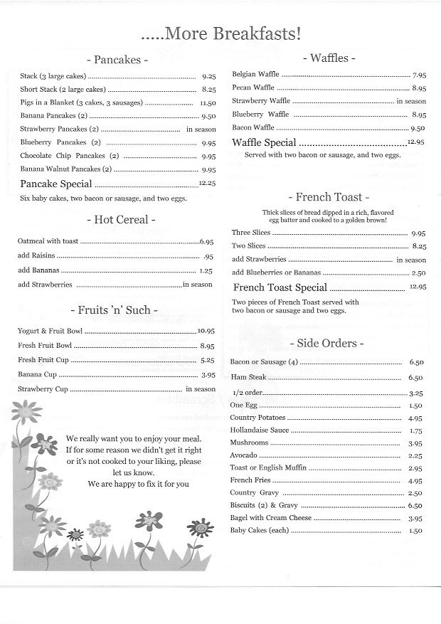 Our omelettes are made with farm fresh eggs. Any omelette can also be scrambled if you prefer. Includes pancakes or potatoes and toast. Watching your health? Have one of our omelettes with no eggs yolks!