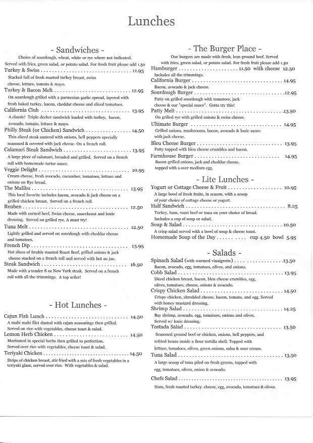 Turkey, ham, or tuna on your choice of bread. Includes a cup of soup or salad.